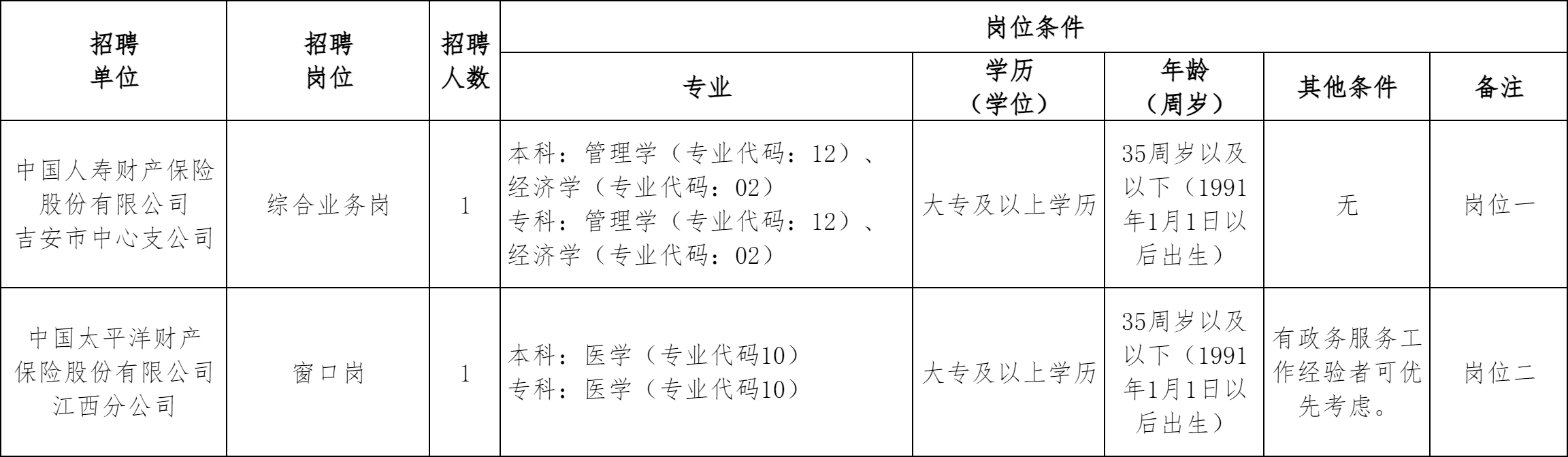中国人寿财产保险股份有限公司吉安市中心支公司、中国太平洋财产保险股份有限公司江西分公司为吉安市大病保险业务中标单位,现因工作需要,面向社会公开招聘联合办公人员,派驻到吉安市医疗保障局工作,现将有关事项公告如下: